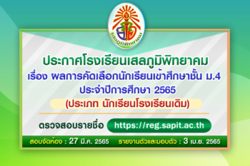ประกาศผลการคัดเลือกนักเรียนเข้าศึกษาชั้นมัธยมศึกษาปีที่ 4 ปีการศึกษา 2565 (ประเภท โรงเรียนเดิม)