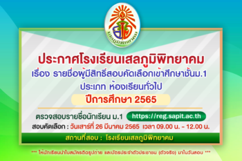 ประกาศโรงเรียนเสลภูมิพิทยาคม เรื่อง รายชื่อผู้มีสิทธิ์สอบคัดเลือกเข้าศึกษาชั้นม.1 ประเภท ห้องเรียนทั่วไป ปีการศึกษา 2565