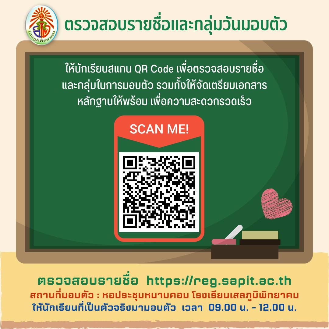📲ให้นักเรียนสแกน QR Code เพื่อตรวจสอบรายชื่อ และกลุ่มในการมอบตัว รวมทั้งให้จัดเตรียมเอกสาร หลักฐานให้พร้อม เพื่อความสะดวกรวดเร็ว หรือคลิกที่ลิงค์นี้ 👇👇👇