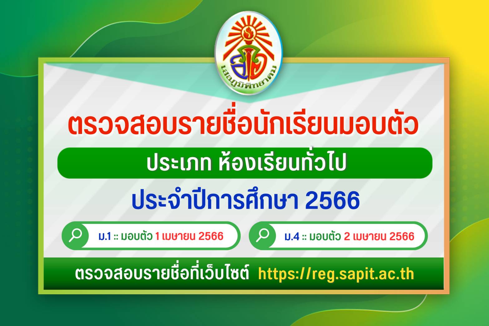 🚩ตรวจสอบรายชื่อนักเรียนมอบตัวชั้นม.1 และ ม.4 ประเภท ห้องเรียนทั่วไป ประจำปีการศึกษา 2566